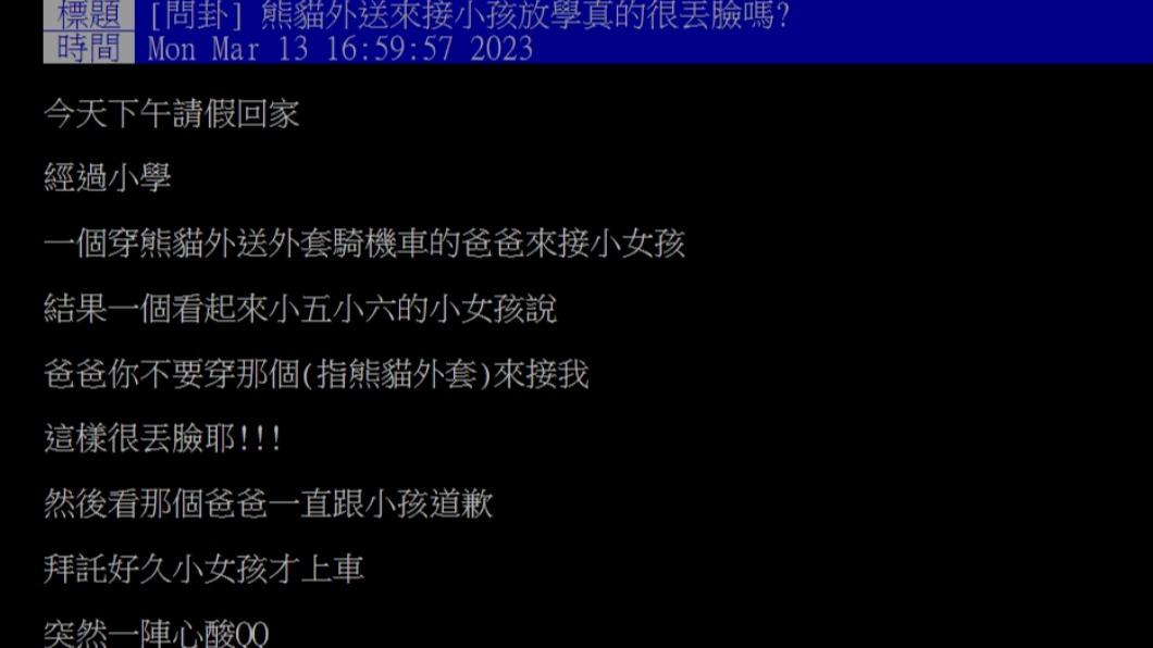 原po在PTT發文說,他13日下午請假回家,剛好經過小學門外,看到一個穿著熊貓外送外套、騎著機車的爸爸來接女兒放學。看起來約5、6年級的女兒對爸爸抱怨說:「爸爸你不要穿那個(熊貓外套)來接我,這樣很丟臉耶!」