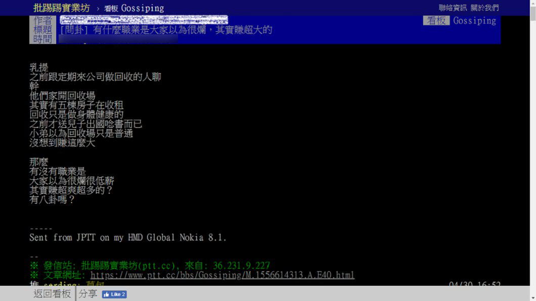 原po以「有甚麼職業是大家以為很爛,其實賺超大的?」為題在PTT發文。他首先分享了自己的經歷,他與來公司固定撿回收的人聊天,發現對方家裡是開回收場,有5棟房子在收租,出來撿回收「只是做身體健康的」。對方還說,前陣子剛把兒子送出國念書。