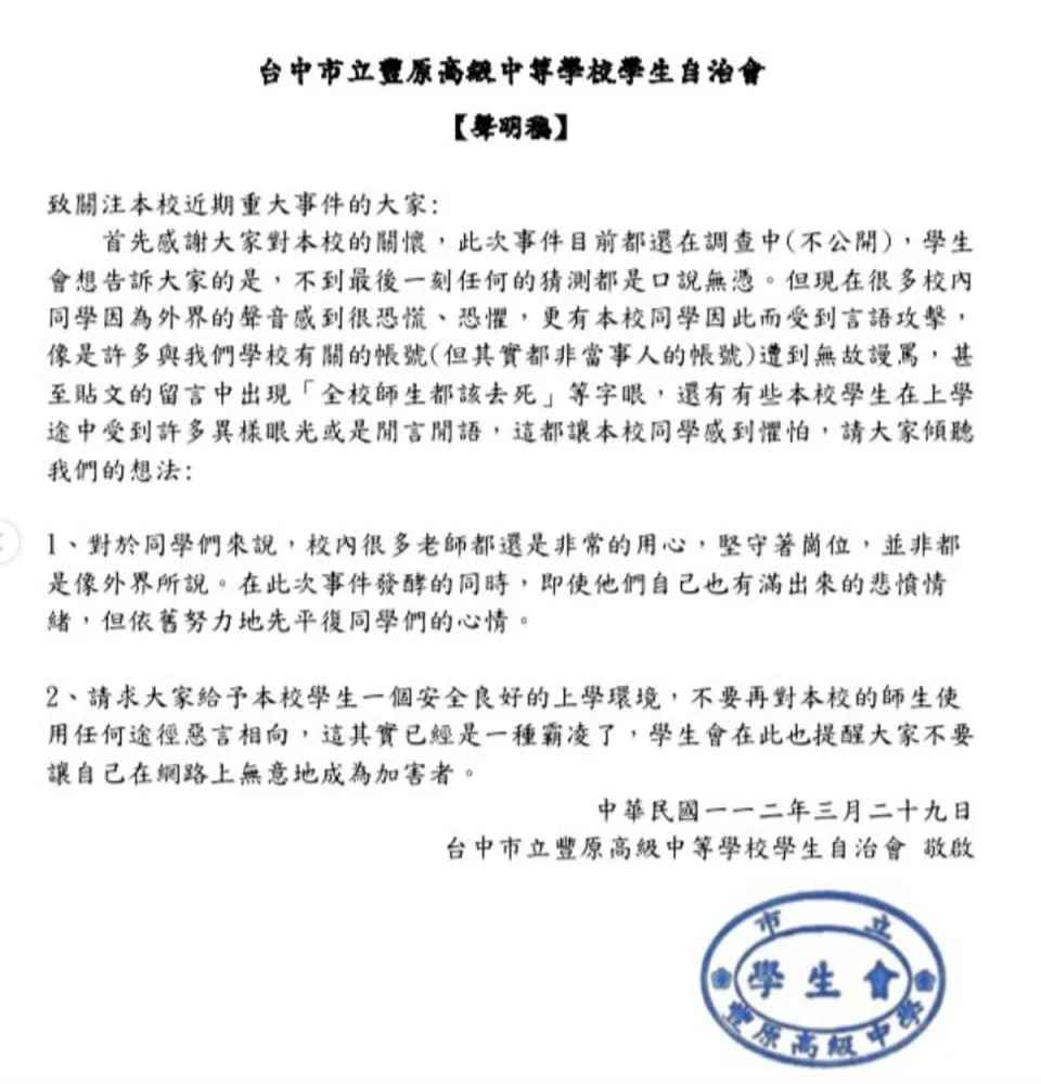 ▼這件事曝光後,網路上充滿針對該校師長的謾罵。對此,豐原高中學生自治會在社群發出聲明,首先感謝各界對此事的關懷,不過此事還在調查當中,「不到最後一刻任何的猜測都是口說無憑」。