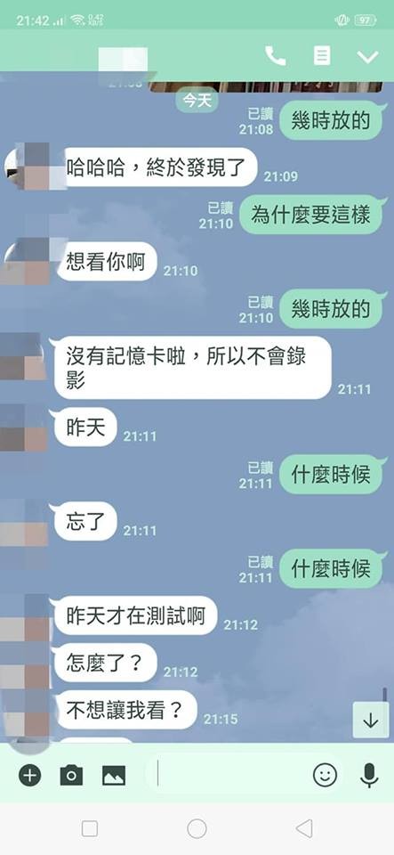 原po環顧四周,發現男友在書櫃偷裝了監視器。男友辯解說:「原本是買來拍家裡寵物的,但後來又收了起來….」原po生氣質問對方「幾時放的?為什麼要這樣?」男友竟笑笑回答「哈哈哈,終於發現了,想看你啊」、「沒有記憶卡啦,所以不會錄影」、「昨天才在測試,怎麼了?不想讓我看?」