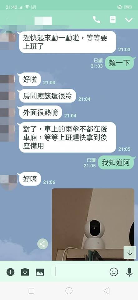 原po在臉書社團「爆怨公社」發文說,她晚間近9點剛剛起床,就收到男友傳來的訊息問「鼻鼻起床啦!這麼早起!」當下她大傻眼,問對方「我都還沒已讀,就知道我起床?」男友笑說自己是用猜的。接著原po順手關掉電風扇,男友竟然又傳訊說「房間應該還很冷,外面很熱唷!」這讓原po毛骨悚然。