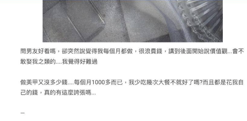 ▼原po對此非常難過,她認為做美甲沒有很貴,每個月只花大約1千多元,少吃幾次大餐就可以了。而且做美甲的費用都是自己在負擔,她忍不住感嘆:「真的有這麼誇張嗎?」