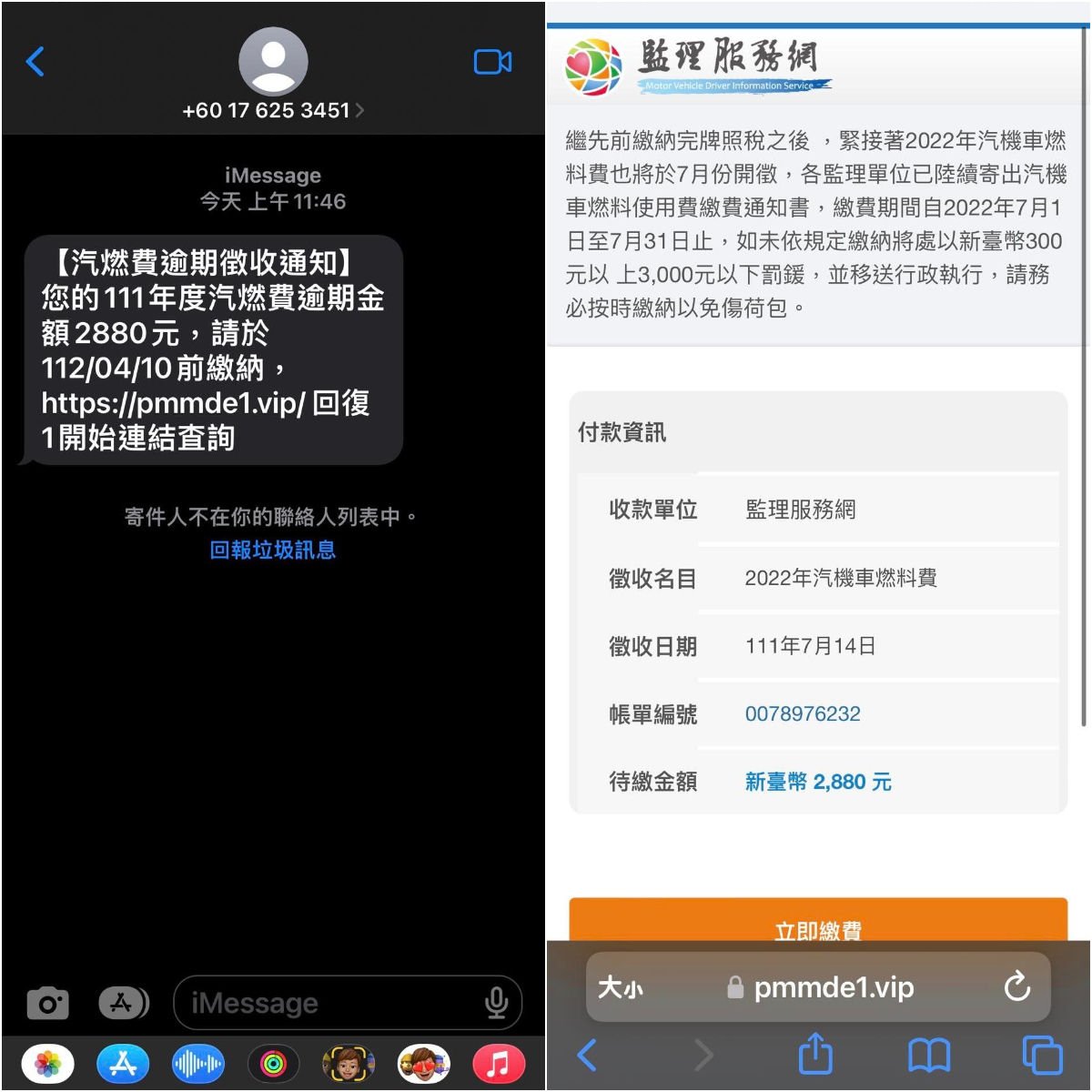 原po好奇點開查看,發現該網站竟然偽裝成了官方的「監理服務網」,上面寫著2022年汽機車燃料費及待繳金額為2880元。該詐騙網站還警告說,未按規定繳納款項將面臨300元至3000元的罰款。