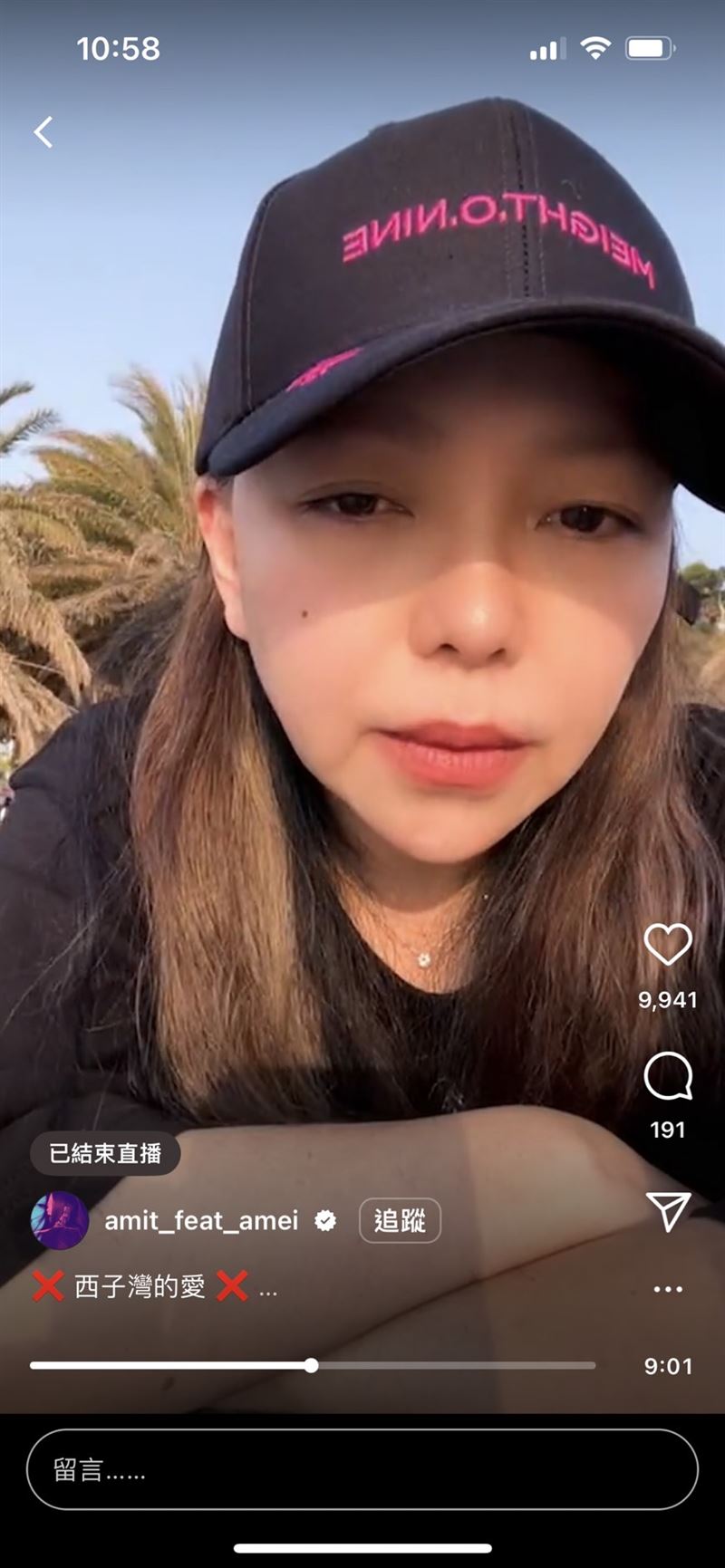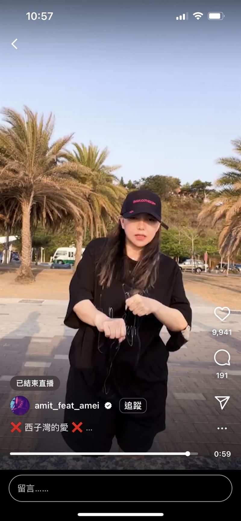 ▼阿妹11日下午無預警開直播,表示自己正在西子灣看夕陽。她開心說:「你不覺得這光很美嗎?很chill,在這裡很舒服,陽光很好,人沒那麼多。」興致一來,她還在鏡頭前跳起舞來。