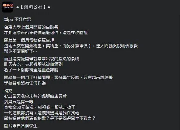 2023年04月13日日前一名台東大學女學生在臉書爆料說,校內上個月新開幕的自助餐價格很貴,1份主菜搭配4樣配菜再加上一碗白飯就要價180元。她前往用餐的時候,「夾起雞腿就被血滴到」,這名女大生還貼出血色雞腿的照片。該自助餐的價格、食品安全問題迅速成為網友們討論的話題。