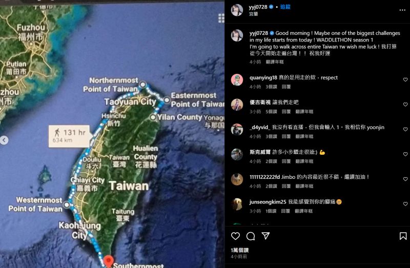 ▼企鵝妹23日在IG上用英文寫下:「大家早安!這也許會是我人生中最大的挑戰、就從今天開始!我將要橫跨整個台灣,祝我好運!」隨後她又用中文表示:「我打算從今天開始走遍台灣!!祝我好運。」她曬出徒步從宜蘭到墾丁的地圖,長達634公里,耗時長達131小時。
