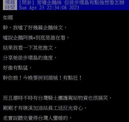 ▼有網友在PTT八卦板以「常噴企鵝妹,但徒步環島有點強想看怎辦」為題發文說,他過去曾噓了好幾篇有關企鵝妹的貼文,但企鵝妹「走遍台灣」的宣言曝光,又看了企鵝妹的路線圖、進度後,反而覺得對方「好像有點猛」。此外,企鵝妹啟程後時不時就會遇到貼心的「騎士團」護駕、贈送物資,甚至還有加油站員工給她一件反光背心。對此,原po笑說,雖然這些插曲有些搞笑,但也忍不住有點想要點開企鵝妹的直播,偷偷關注一下她的最新進度。