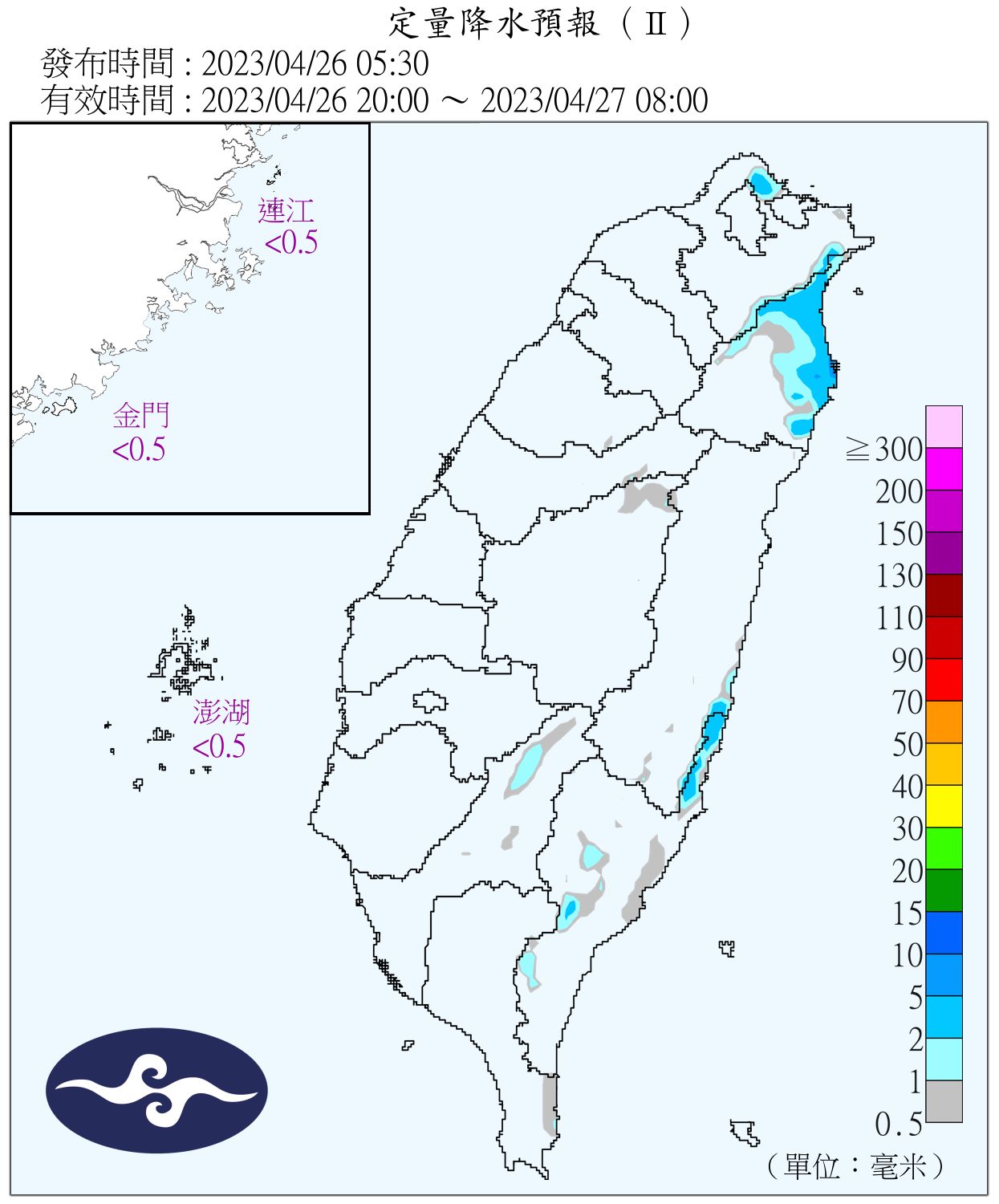 下週一(5/1日)、下週二(2日)東北季風減弱,轉為東風,氣溫逐日回升,東半部有局部短暫雨,午後山區有局部短暫陣雨。另外,本週五、週六西半部易有局部霧,週六馬祖亦有局部霧,大家請做好準備~