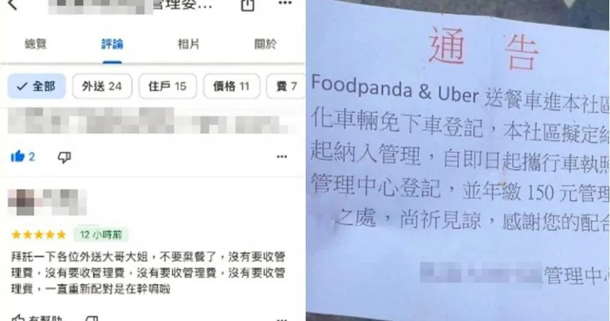 ▼網友們看到這件事都覺得很不可思議,許多外送員更在外送員群組中討論這個社區大樓,痛批「以後這社區我都不送了,一律拒單」。事後雖然傳出管委會緊急撤銷公告,但許多外送員仍沒有消氣,在Google Map上註記這個社區,「外送員要留下150買路財」。
