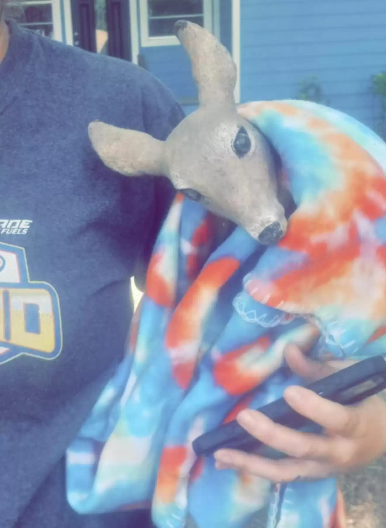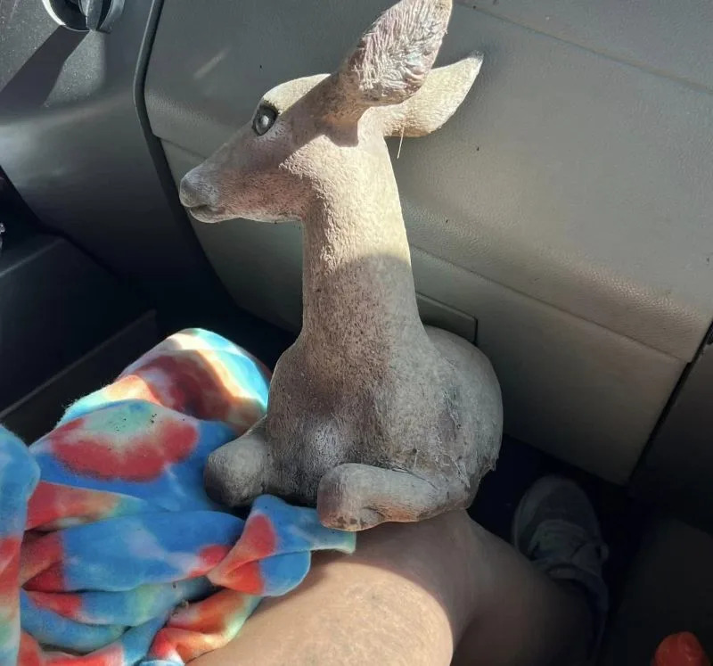 ▼根據以往的救援經驗,受困的動物看到有人靠近,都會非常緊張,但那隻小鹿卻超級安靜,就像沒有生命。Tosha這才看清,那是一個被丟棄的小鹿造型塑膠裝飾品!她哭笑不得,只好將這個裝飾品「救」出來,展示給現場的其他人看。