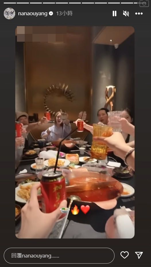 ▼合照曬出不到半天時間,3姊妹的超高顏值就吸引2.5萬人按讚關注。歐陽娜娜也留言說「Love You」,還附上愛心圖案。期間她也分享一段聚餐影片,可以看到歐陽龍、傅娟和親友一起舉杯,眾人面前的桌子上擺滿美食,氣氛熱鬧歡樂。