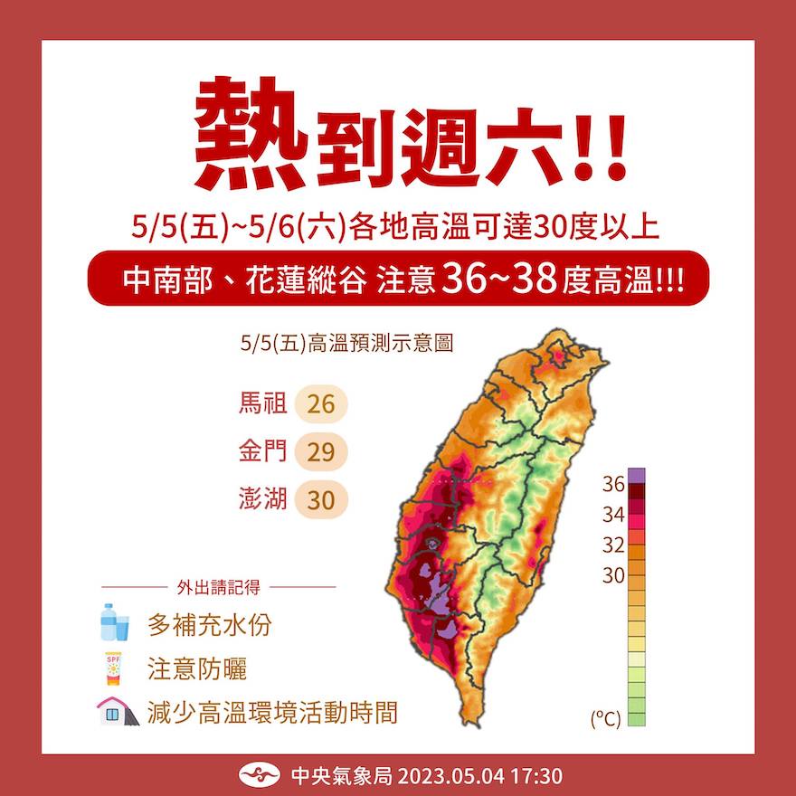 根據中央氣象局表示,今天各地為多雲到晴,僅東半部地區及午後西半部山區有零星短暫陣雨。各地低溫23到25度,白天氣溫普遍都在30度以上,中南部及花東局部地區有36度以上高溫,甚至在南部近山區更有38度高溫發生的機率。