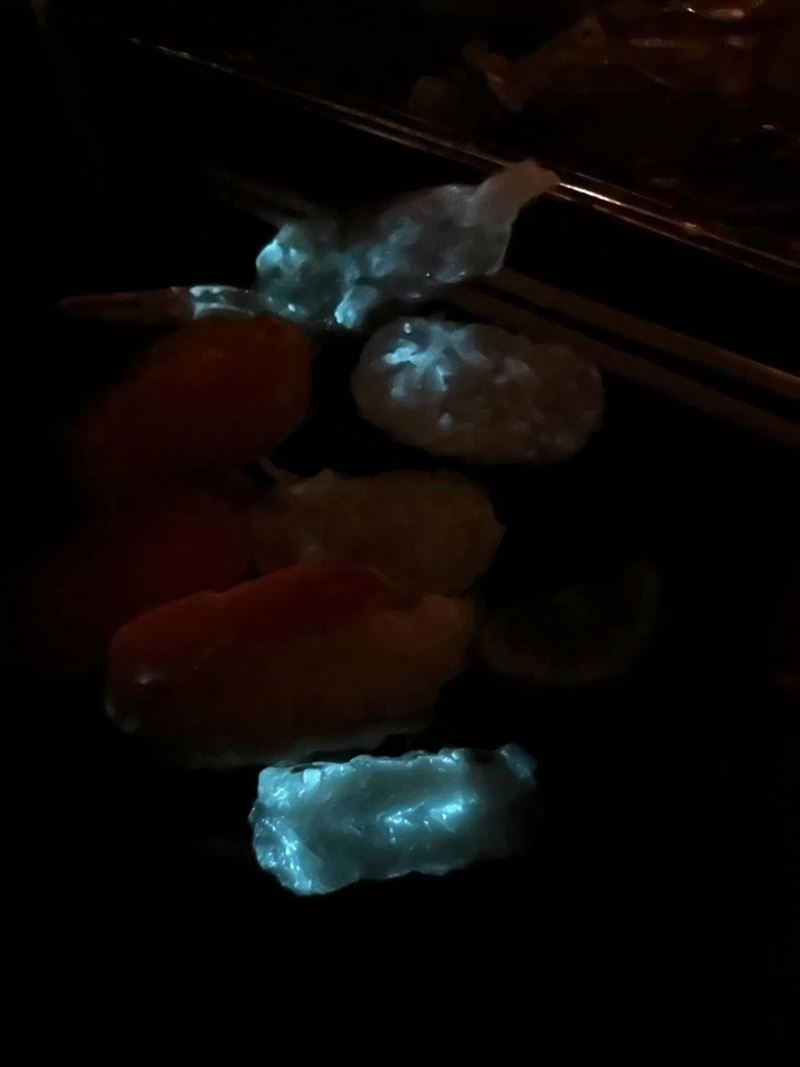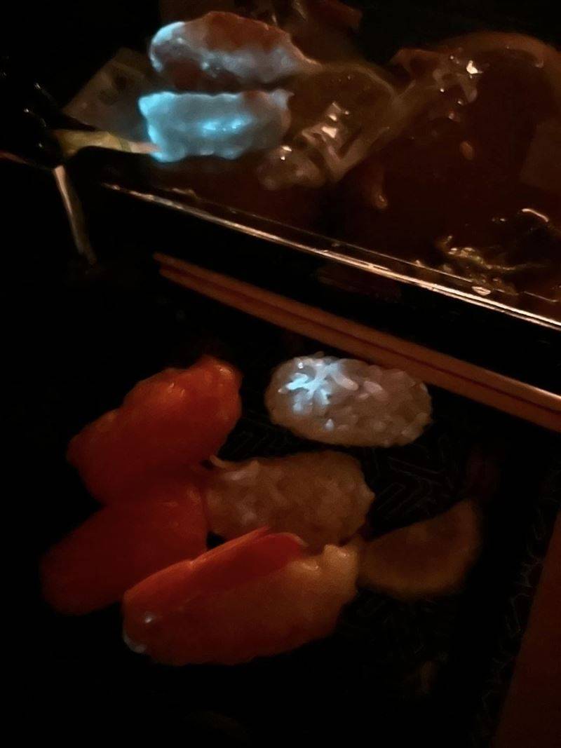 ▼原po在臉書社團「爆料公社」發文說,自己5月4日外帶一盒壽司,沒想到關燈後竟看到驚人場景,「沒有在拍鬼片,在室內卻發現大蝦壽司會莫名發光,連白飯也發光,可是小蝦卻沒有,有點難想像我之前吃的有無其他問題」。