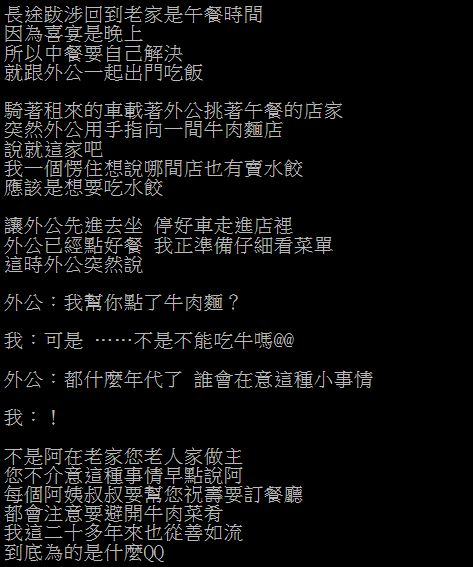▼原po聽到外公的話大崩潰:「這20年來從善如流,到底為的是什麼!」他忍不住喊:「每個阿姨叔叔要幫你祝壽訂餐廳時,都會注意要避開牛肉菜餚」,「您不介意這種事情早點說啊!」