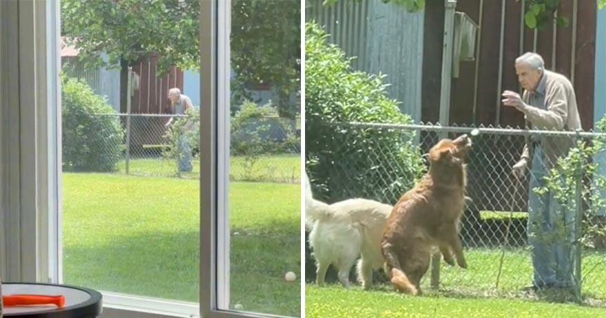 ▼從Kimberly拍攝的畫面可以看到,Bill緩緩走到庭院圍欄邊,等待狗狗們到來。Charlie和Doug發現鄰居到來,連忙熱情地跑過去打招呼。Bill則拿出準備好的點心給狗狗們餵食,並跟狗狗們互動。