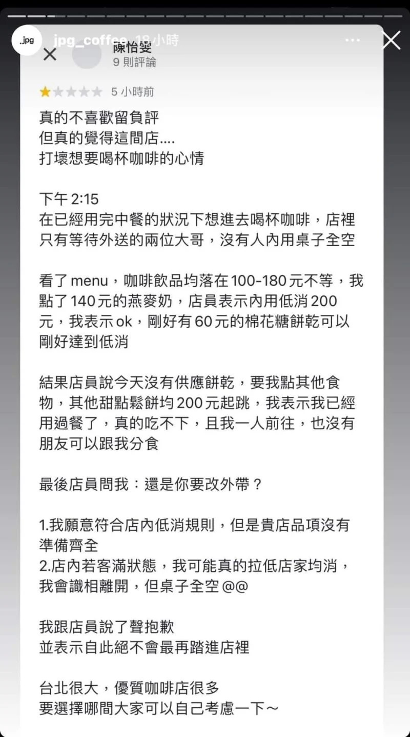 ▼事後陳女在Google評論留言說「我願意符合低消原則,但是貴店產品準備不週全,還要客人硬點一個200元的鬆餅,店內如果是客滿我會識相,但是全空的狀態實在很難讓人信服,台北很大,優質咖啡店很多。要選擇哪間大家可以自己考慮一下」,並留下一星負評。