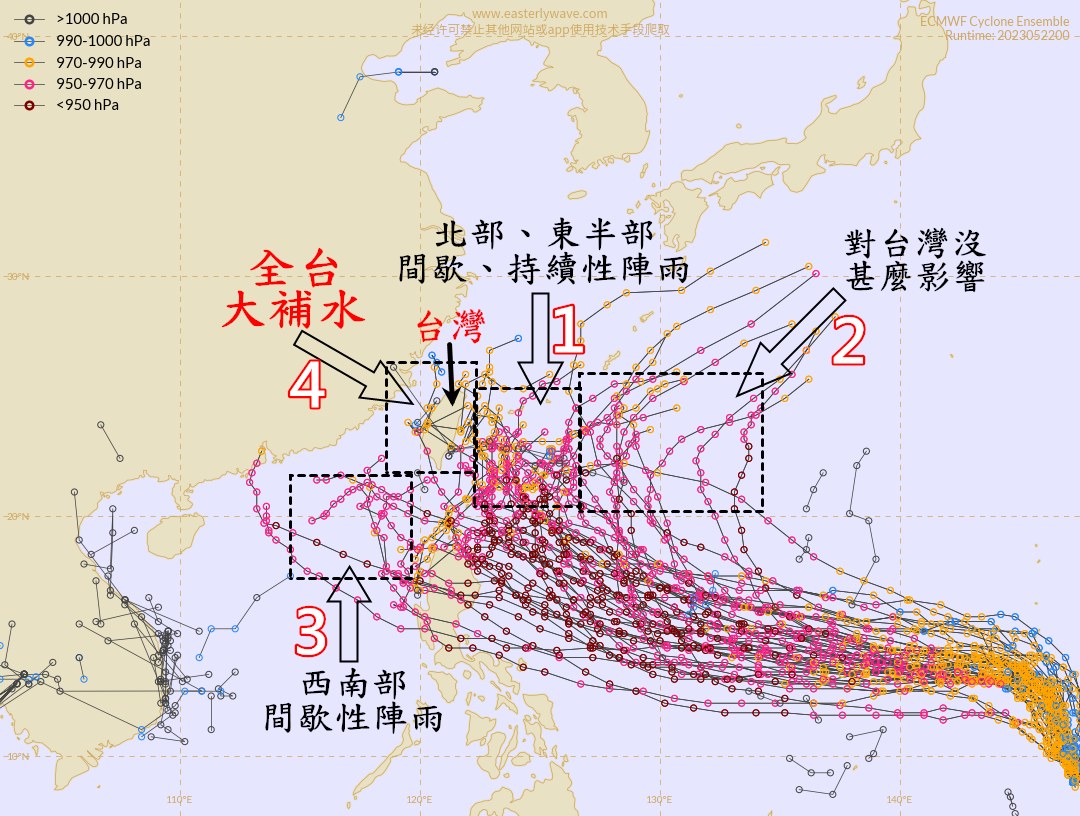 ▼氣象愛好粉絲團「觀氣象看天氣」根據歐洲中期天氣預報中心最新的系集預測路徑分析,瑪娃颱風對台灣可能的影響,顯示有4種路線的可能:第一條機率最高,也就是從東部海面北上,將為北部、東半部帶來間歇、持續性陣雨,且距離越近雨勢越大。第二條機率次之,將從台灣東邊遠遠的海面北轉,對台灣沒什麼影響。