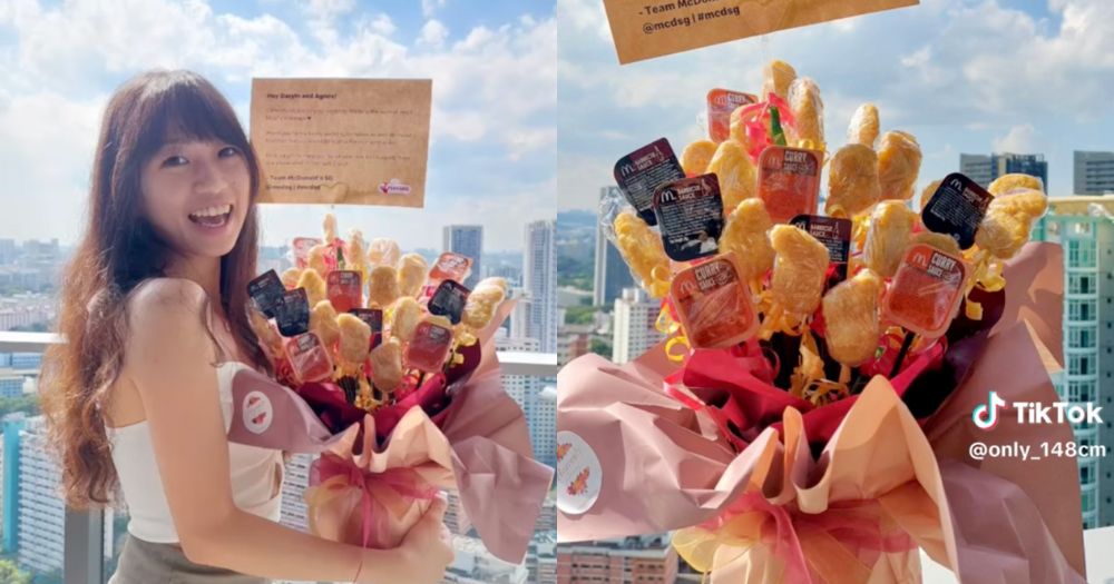 2024年02月11日新加坡有一對情侶在戀愛期間經常到一家麥當勞用餐,這間麥當勞餐廳見證了他們愛情發展的每一個階段。兩人準備結婚時,邀請親友們來參加婚宴,突發奇想給這間麥當勞也發了一份喜帖,沒想到真的得到了回應!麥當勞特別送上超豪華的「麥克雞塊花束」,用美味祝他們幸福~