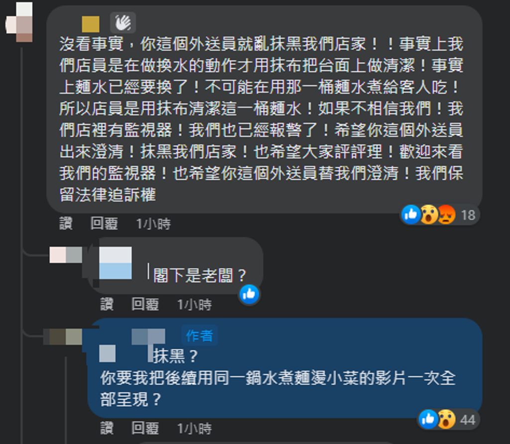 ▼店家則喊冤說,煮麵水會越煮越稠,營業日的下午1點半至2點半會換煮麵水。外送員拍到的畫面是店員在清潔煮麵台,那鍋煮麵水正準備換新,並非用「抹布水煮麵」。還有疑似店家的網友留言稱遭抹黑,且已報警,保留法律追訴權。