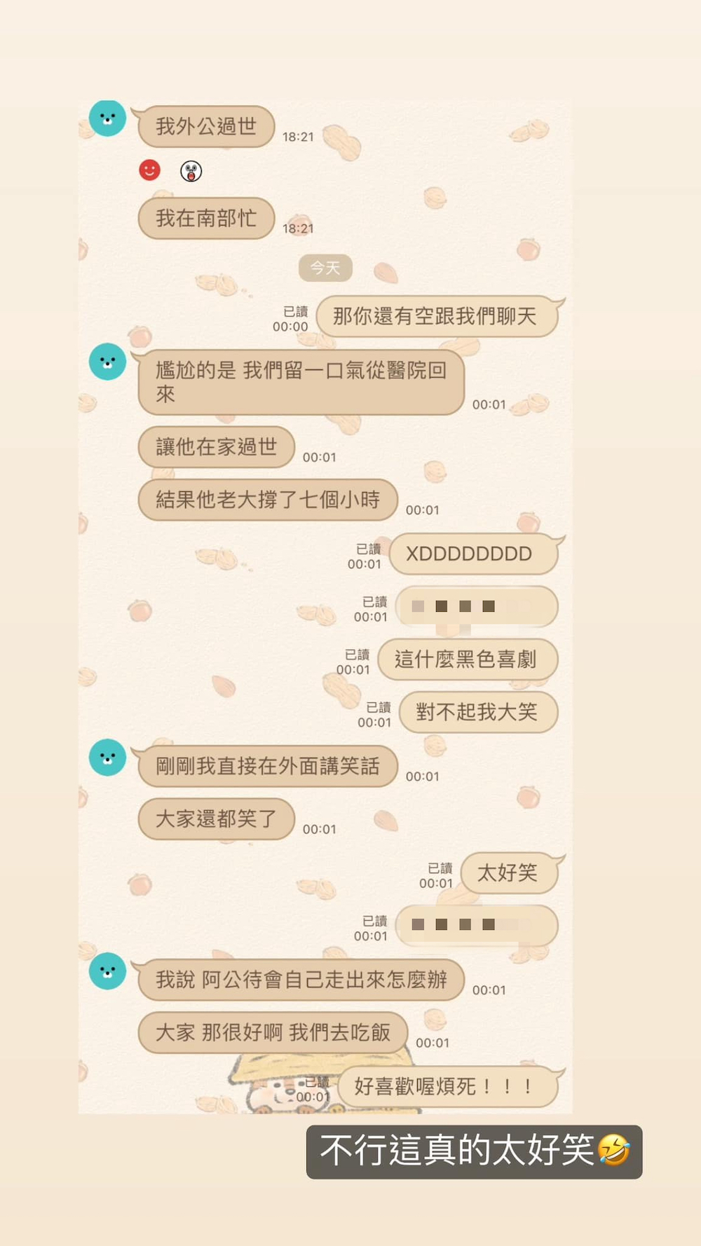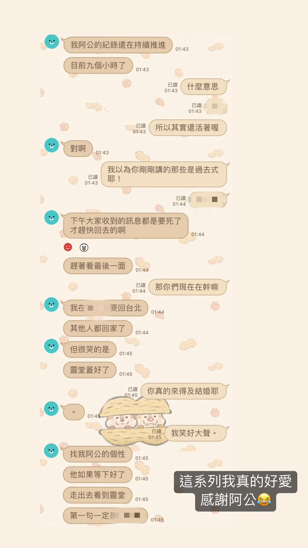 ▼韓璟在臉書貼出一連串與朋友的對話,友人在下午6點時表示,家人正在籌備阿公的後事,阿公今年已經高齡94歲,原本還跟友人約好要等到他結婚才要離開,所以友人在加護病房時滿心愧疚跟阿公道歉,沒有讓他等到。沒想到阿公從醫院回家後,撐了9個小時還沒有斷氣。