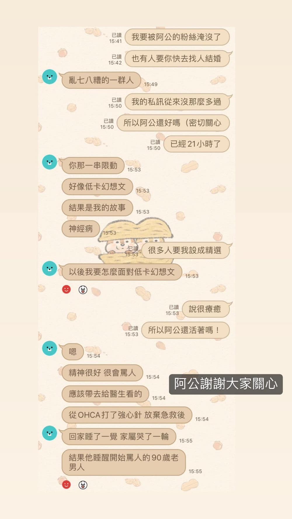 ▼等過了21個小時後,韓璟詢問友人阿公還好嗎,對方回「精神很好,很會罵人,從OHCA打了強心針,放棄急救後,回家睡了一覺,家屬哭了一輪,結果他睡醒開始罵人」。友人還說,阿公已經被送回醫院了。