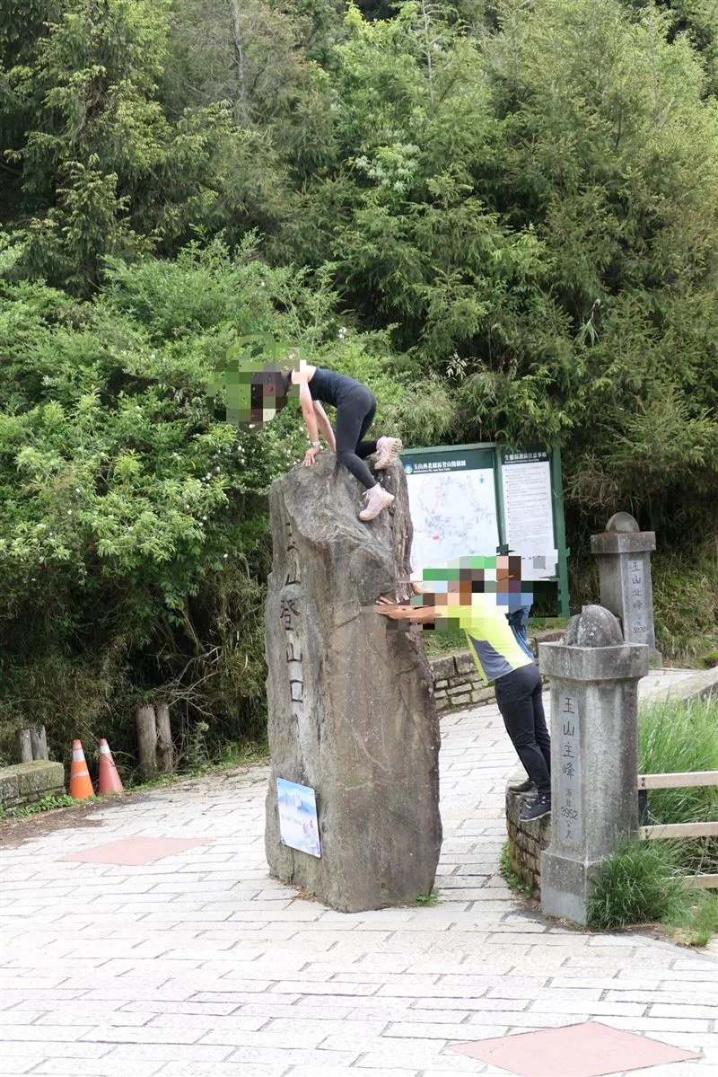 一名山友12日在「登山通報站」分享一張照片,並無奈寫道:「可以這樣?」從照片中可以看到,3人在塔塔加登山口的大石頭前,一名女子疑似為了拍出美照,竟試圖爬上「玉山登山口石碑」最高點,下面的2名男子則為她做安全防護。