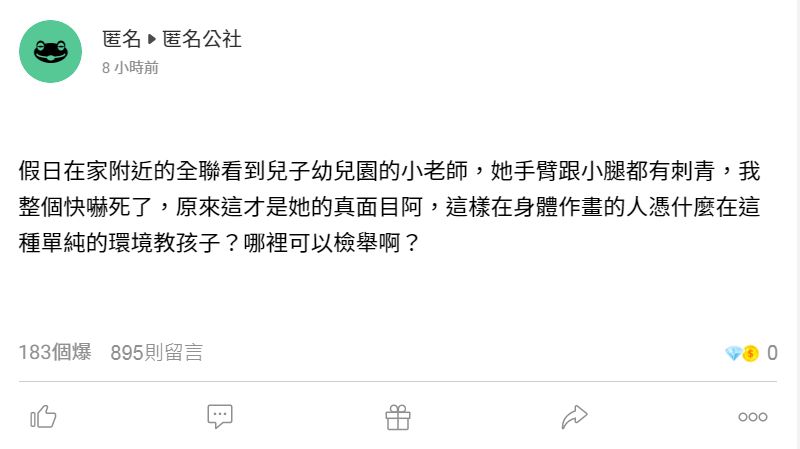 ▼這名家長於12日在臉書社團「匿名公社」發文說,他假日在家裡附近的超市看到兒子的幼兒園老師,卻發現對方的手臂跟小腿都有刺青。他痛批:「我整個快嚇死了,原來這才是她的真面目阿,這樣在身體作畫的人憑什麼在這種單純的環境教孩子?哪裡可以檢舉啊?」