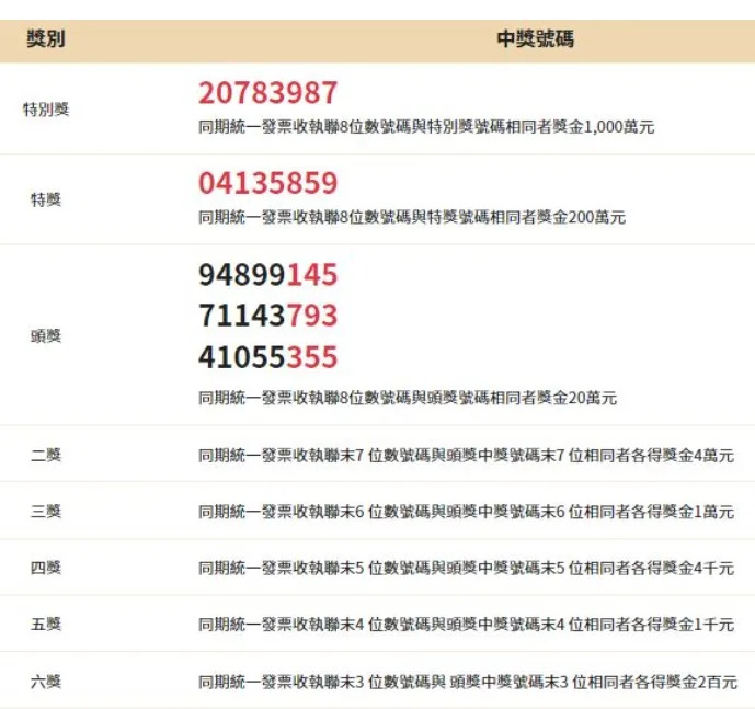 200萬元特獎方面,中獎號碼為「04135859」,中獎發票共有17張,其中消費金額最低則是花20元購買食品。