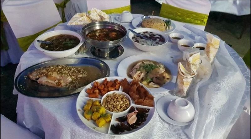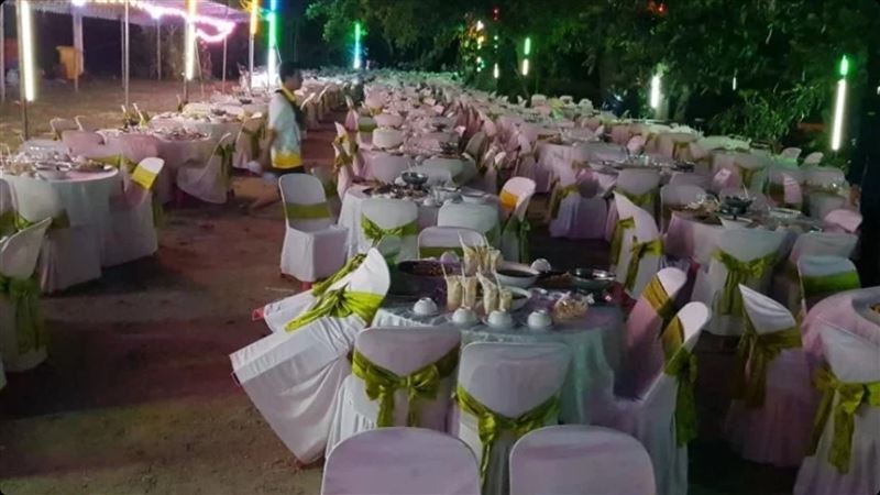 ▼這次受委舉辦宴席的阿南表示,那名幸運兒拿出10%的獎金,也就是24萬泰銖(約台幣2萬1266元),委託他準備200桌酒席,每席預算為1200泰銖(約台幣1千元),共有8道菜含一甜品。從畫面中可以看到,現場擺放有桌椅碗筷,桌上的菜色也相當豐富,魚、肉、水果俱全。只是這場宴席設在墓園中,位子上空無一人,氣氛有一些詭異。