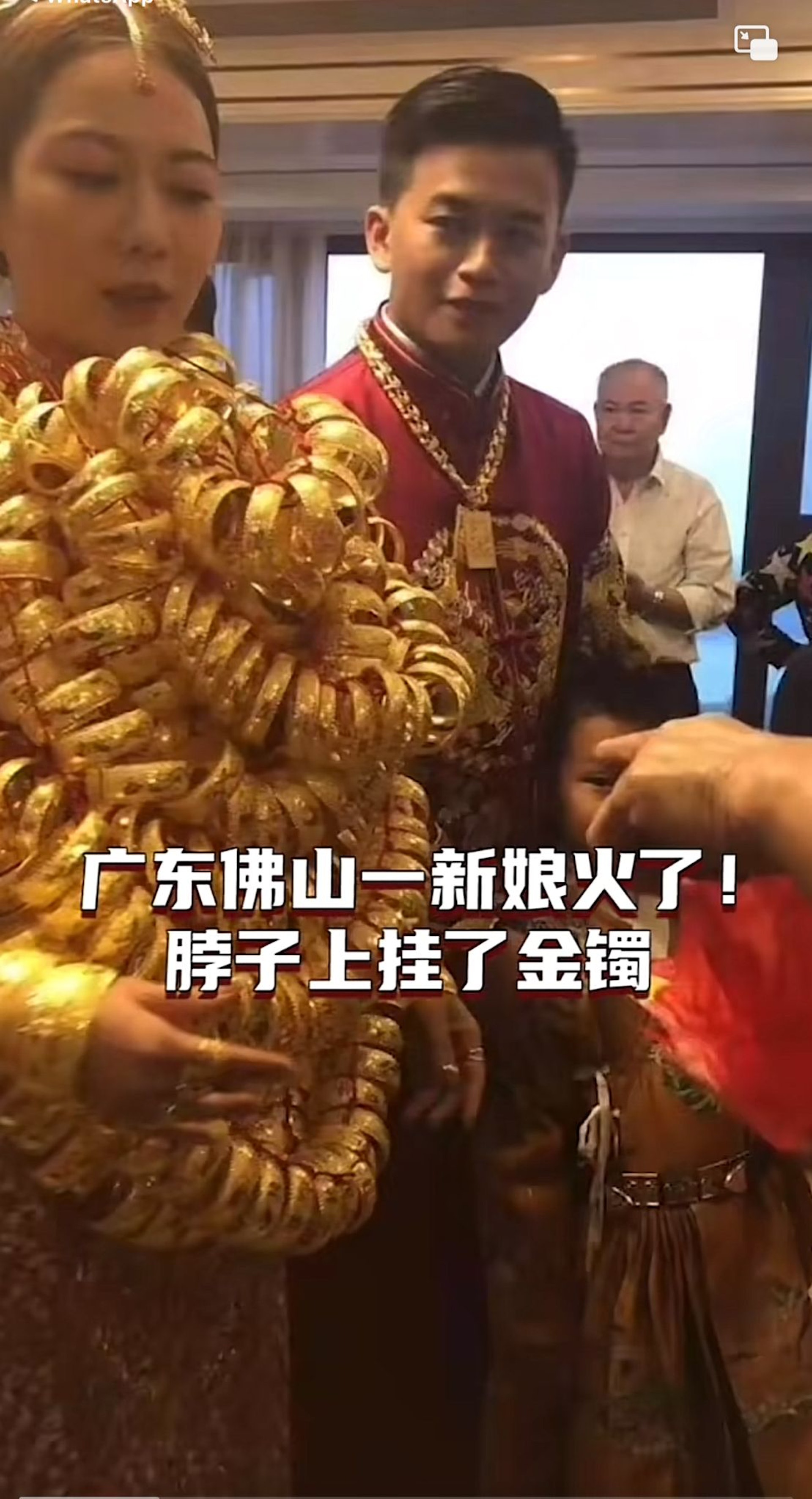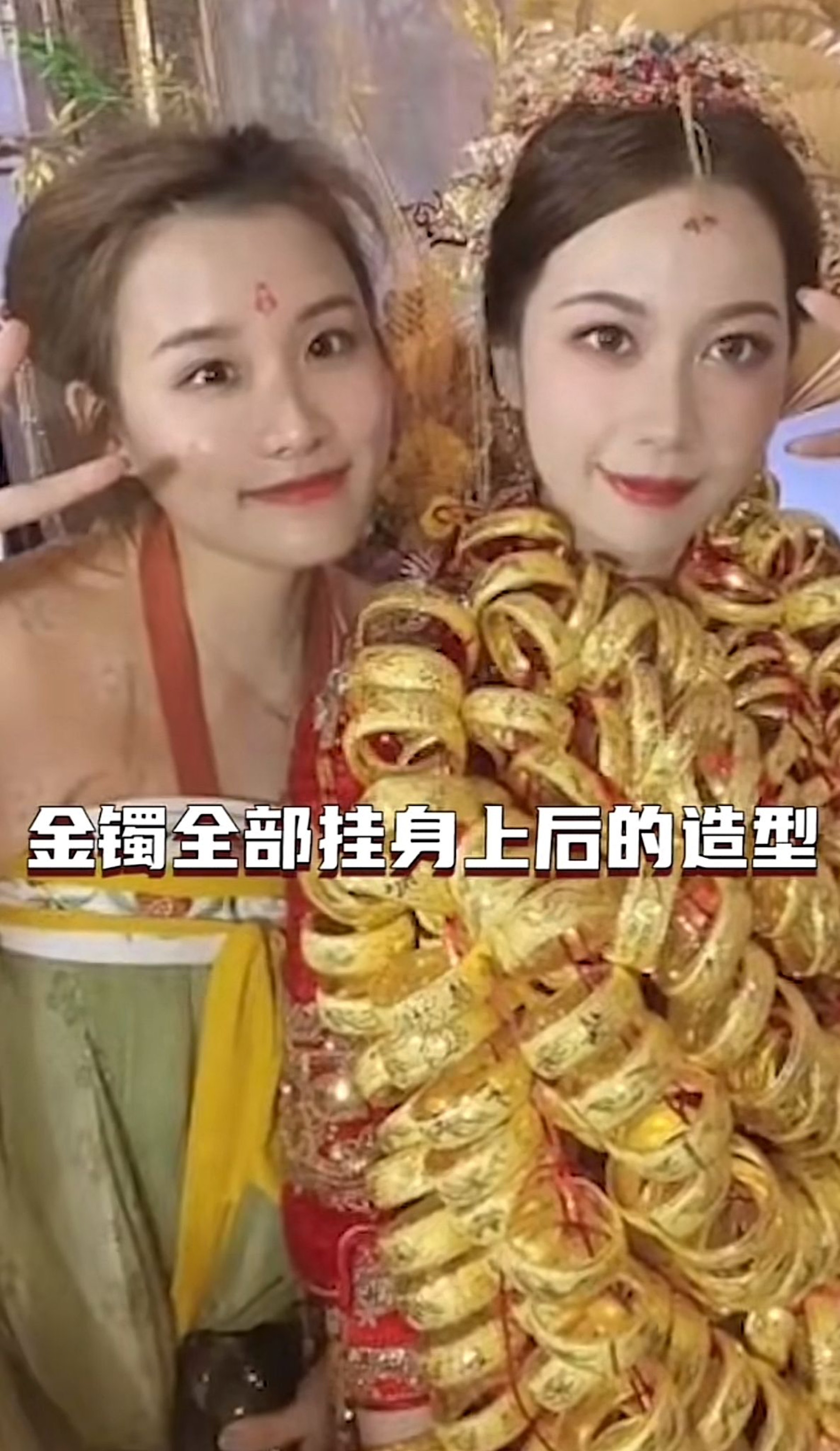 2023年06月26日很多華人父母會為要出嫁的女兒準備金項鍊、金手鐲、金戒指等金飾,希望孩子能風風光光嫁人。一般來說,新娘身上的金飾越多,說明家族財力越雄厚、父母越重視。近日一位新娘在婚禮上的模樣在網路上引發熱議,只見她身上掛滿金飾,臉都被擋住了~