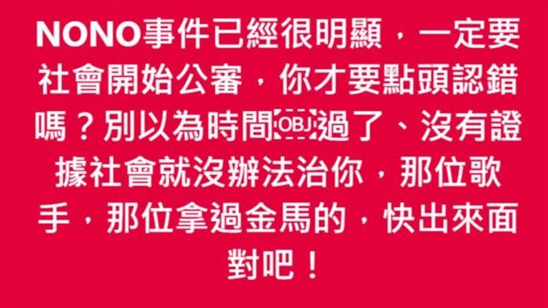 ▼先前葛斯齊針對「黃子佼地圖砲」發聲,表示自己手上握有的零碎證據交叉比對高達95%相符。今天(21日)他又對NONO對性騷擾風波的處理方式提出自己的看法,並藉機向某歌手喊話:「NONO事件已經很明顯了,一定要社會開始公審,你才要點頭認錯嗎?別以為時間過了、沒有證據社會就沒辦法治你,那位歌手,那位拿過金馬的,快出來面對吧!」