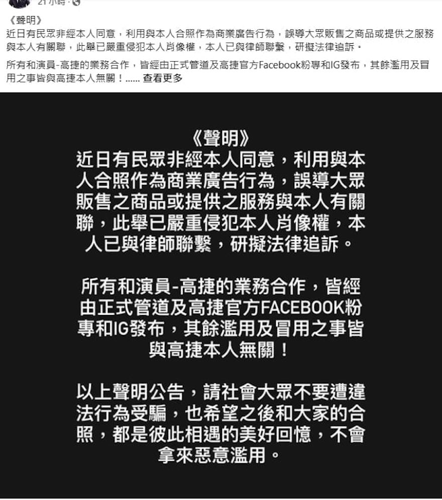 ▼最近有網友爆料,這間無菜單海鮮餐廳的老闆擅用演員高捷的合照打廣告,高捷根本沒有到這間餐廳用餐過,只是與對方合影留念,沒想到竟被拿來打廣告。後來高捷本人留言提醒「老弟,合照是讓你留念,不是讓你拿來廣告,卡尊重咧…請移除」,高捷經紀人也警告說「已侵犯到高捷大哥的肖像權,請你即刻移除」。