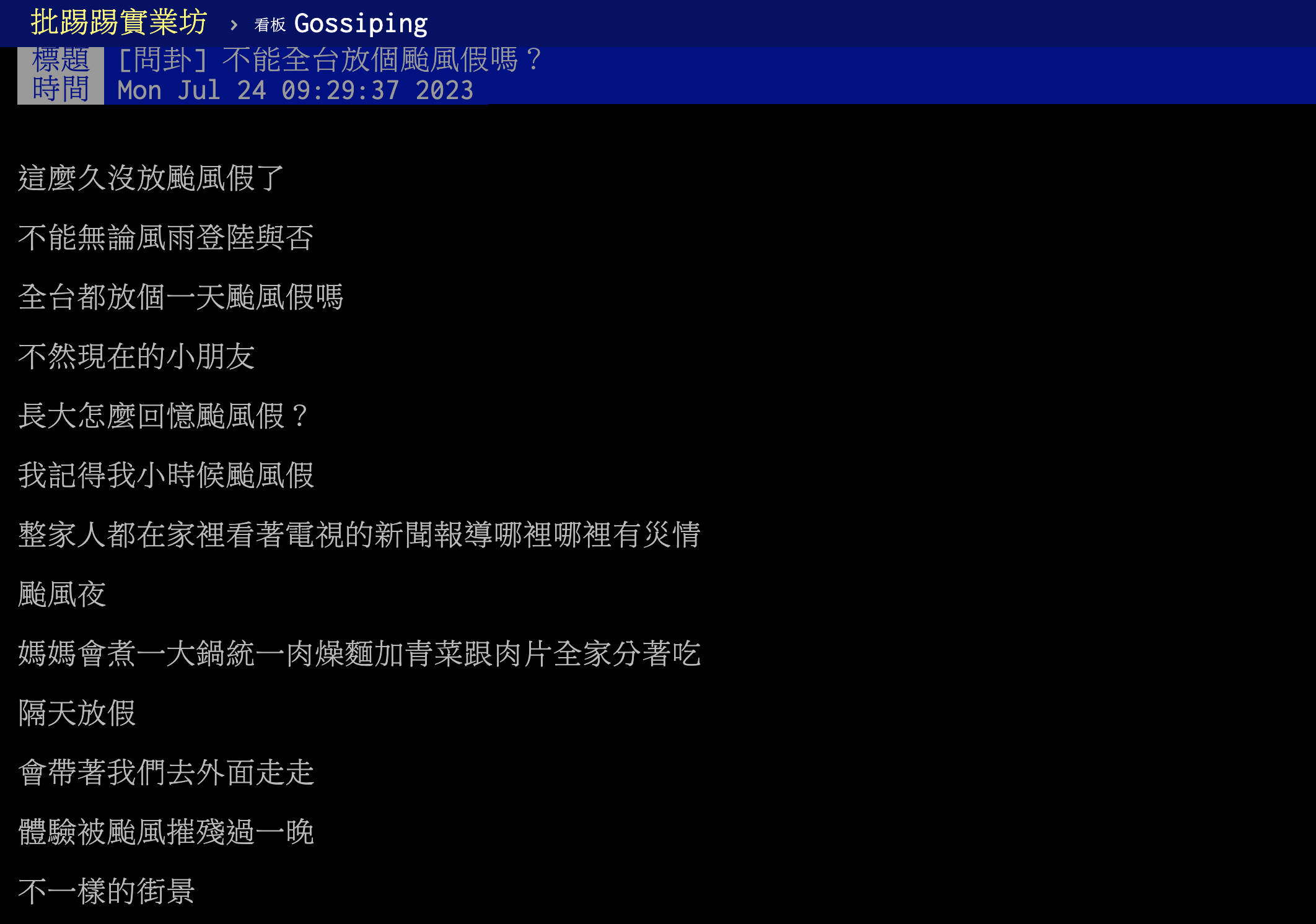 2023年07月24日颱風杜蘇芮即將侵台,帶來雨勢和強風,不容小覷。有人在PTT上提出主張,希望全台都能放「颱風假」,一起停班停課,讓大家共同應對颱風的來臨,重現過去美好的回憶。但網友們卻不讚同~