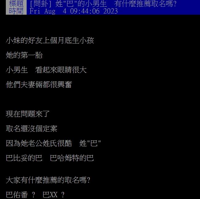 ▼原po在PTT上以 「姓"巴"的小男生 有什麼推薦取名嗎?」為題發文說,妹妹的朋友上月底生了小孩,是一個小男孩,夫妻倆都非常開心,但老公的姓氏很特別,姓「巴」,他們不知道該給小孩取什麼名字,於是發文詢問網友,有什麼好名字可以推薦一下?