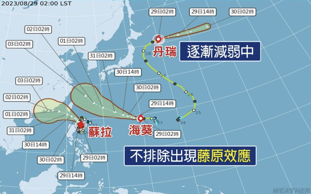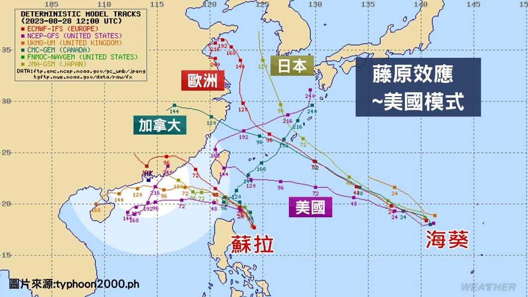 ▼香港天文台指出,「蘇拉」會在未來一兩日大致移向台灣南部至呂宋海峽,隨後靠近福建南部至廣東東部沿岸一帶。同時,蘇拉以東的熱帶氣旋「海葵」會在未來兩三日大致移向琉球群島一帶,可能與蘇拉產生藤原效應,令蘇拉的移動路徑存在較大變數。
