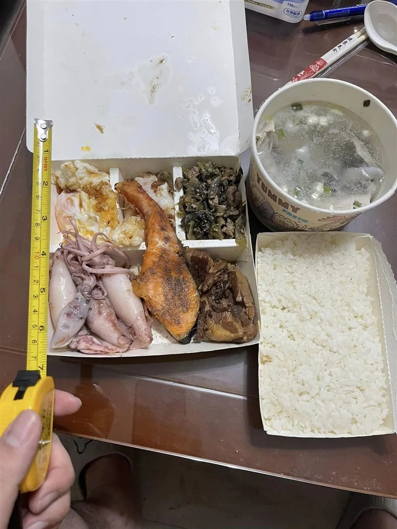 ▼原po在臉書「新竹大小事」貼出一張宵夜照片,只見便當盒中裝有2個荷包蛋、長約4公分的小捲4隻、半片約5公分長的香煎鮭魚、一片控肉搭配一小格的酸菜。原po還點了虱目魚肚湯和白飯,總共花了550元。他聽到價錢時大傻眼,驚訝表示自己知道物價很貴、波動很大,但平常自己也常跑市場買菜,「但根本不至於到這個價格」。
