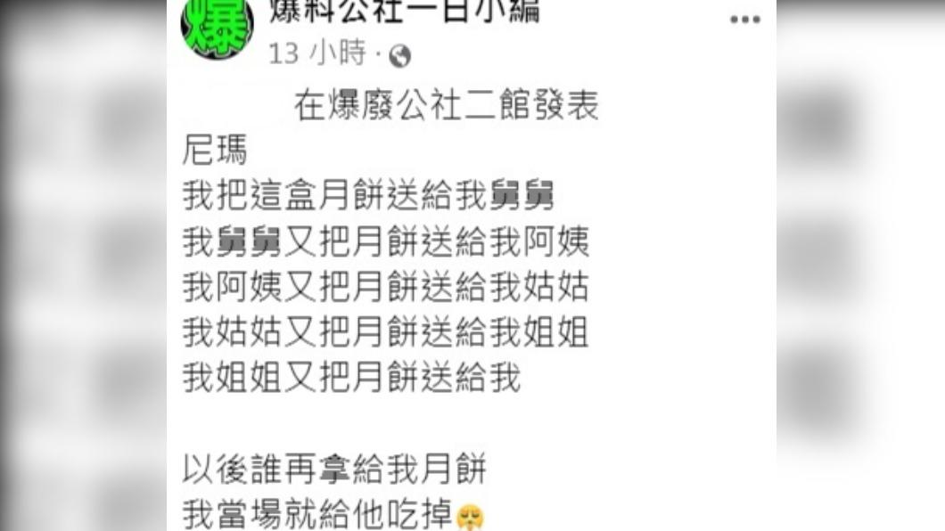▼原po在臉書社團「爆廢1公社」發文說,近日準備過中秋節,他為表示對舅舅的心意,特地買了一盒台式月餅送給對方。沒想到這盒月餅竟在短時間內經歷了一段「奔波旅途」,又重新回到了他的手上。這讓他感覺荒唐又好笑,忍不住說:「以後誰再拿給我月餅,我當場就給它吃掉。」