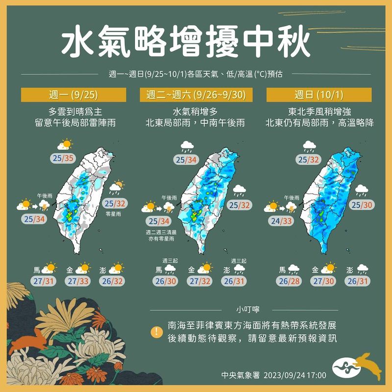 2023年09月26日中秋連假變天!中央氣象署表示,由於受到南方低壓帶及北方高壓前緣偏東風影響,週二(26日)起各地水氣將逐步增多,東半部及北部迎風面將會有局部偶陣雨,山區及中南部在午後也有可能發生局部雷陣雨。尤其在週二至週三(27日)的清晨時段,中南部也可能出現零星降雨,恐對中秋連假造成一定的影響。