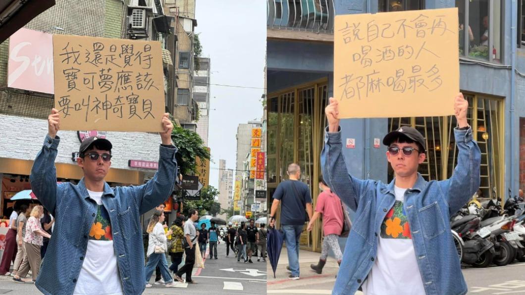 ▼阿滴在其臉書粉絲專頁發文說,自己被朋友問到「你連假最後一天要幹嘛?」對此,他直接曬出了4張在捷運站外高舉字牌的照片。從照片中可以看到,阿滴戴著墨鏡、一臉嚴肅地高舉牌子,上面的字眼直白而有趣,如「爆雷的人應該要抓去關」、「你不是內向,你只是懶惰出門」、「說自己不會再喝酒的人都麻喝最多」、「我還是覺得寶可夢應該要叫神奇寶貝」。