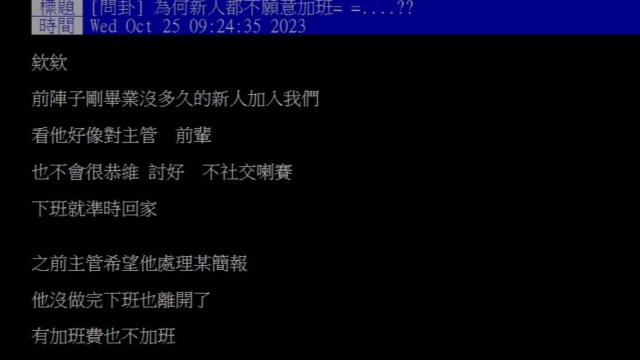 2023年10月31日日前一名網友在PTT八卦板發文說,公司內一名新入職的年輕員工,面對主管和同事,既不恭維、也不主動交際,更重要的是,這名新人下班時間到了絕不拖延,直接離開工作崗位,即使有加班費,也堅決不加班。原po對此很不解:「為何現在20歲出頭的年輕人,都不願加班了呢?不想往上衝刺晉升嗎?」