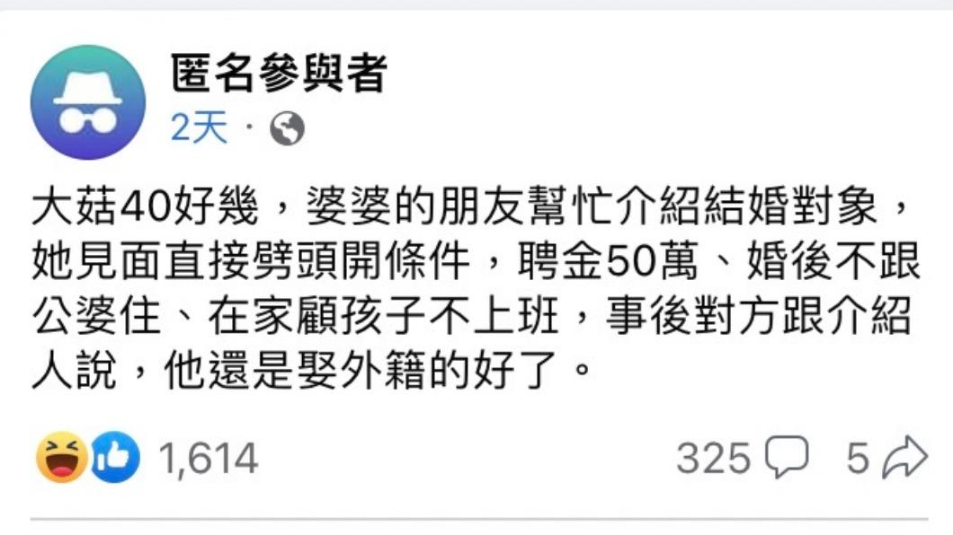 ▼原po發文說:「大姑40好幾,婆婆的朋友幫忙介紹結婚對象,她見面直接劈頭開條件,聘金50萬、婚後不跟公婆住、在家顧孩子不上班,事後對方跟介紹人說,他還是娶外籍的好了。」