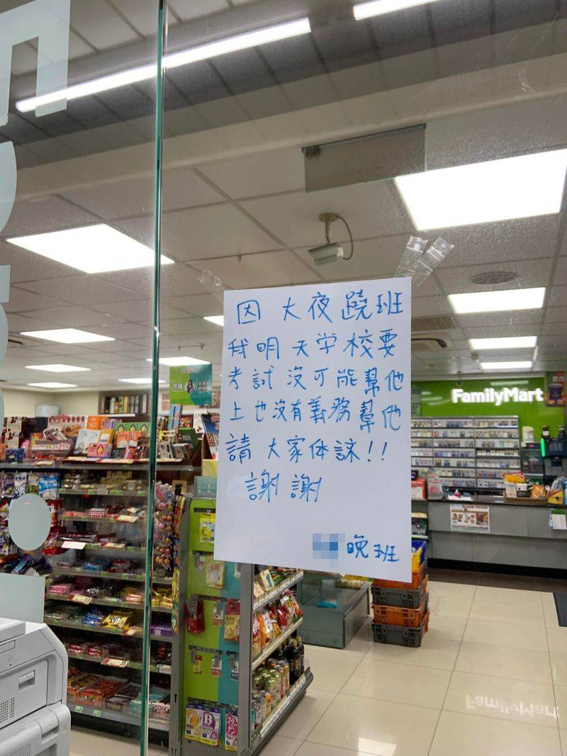 ▼一名網友在臉書社團「路上觀察學院」發文說,他路過超商時發現大門緊閉,門上還貼著一張紙條,上面寫著:「因大夜翹班,我明天學校要考試,沒可能幫他上,也沒義務幫他,請大家體諒!!謝謝!」