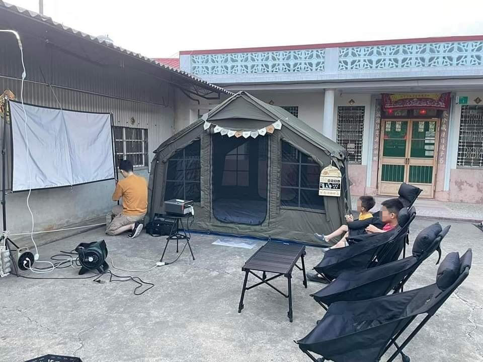 ▼從原po分享的幾張照片可以看到,三合院裡搭起三個大帳篷,還在天地間架起了投影機布幕,雖然是在家裡露營,但裝備齊全,儀式感滿滿。原po認為,雖然無法上山露營有點遺憾,但這樣的家族小團露也會是個美好的回憶。