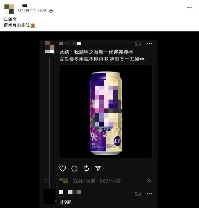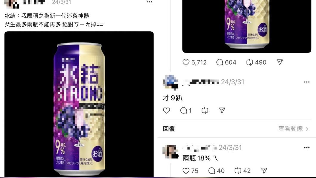 這名女網友在Threads上發文提醒說,某款葡萄口味的酒女生最多只能喝2罐,否則直接斷片。一些網友看到後不解,認為酒精濃度只有9%。原po則回覆說:「兩瓶18%。」