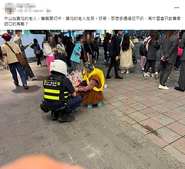 一名網友在臉書社團「爆怨2公社」發文說,近日在中山站看到一名警察蹲在地上與賣花老婦交談,老婦當場流淚。這讓原po忿忿不平,忍不住質疑:「那麼多通緝犯不抓,為什麼會只對養家餬口的為難?」