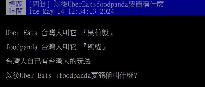 ▼這項併購消息立即引發了各界的廣泛討論,一名網友在PTT上以「以後UberEatsfoodpanda要簡稱什麼」為題發文說,台灣人喜歡把Uber Eats稱作「吳柏毅」,而foodpanda是「熊貓」,以後這2個外送平台合併,又該如何稱呼呢?
