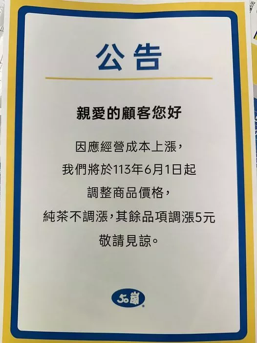 ▼業者補充說,這次調漲不包含「純茶類」,紅茶、綠茶、青茶、烏龍茶等價格維持不變。目前各門市已陸續在臉書粉專貼出漲價公告:「因應經營成本上漲,將於113年6月1日起調整商品價格,純茶不調漲,其餘品項調漲5元,敬請見諒。」