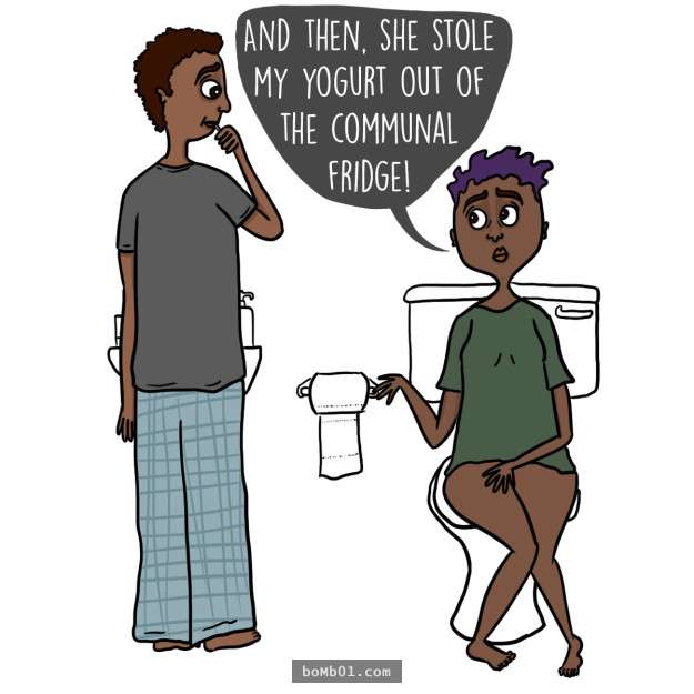 ▼6. 第一次一邊尿尿,一邊神態自若地和對方談天說地。「她就這樣從大家共用的冰箱裡偷走了我的優格…」