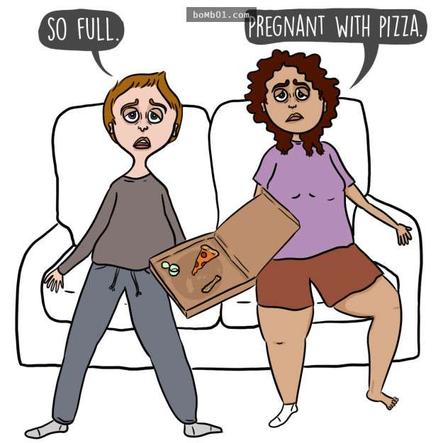男:「我好飽。」女:「我懷孕了,肚子裡全是披薩…」(噗)