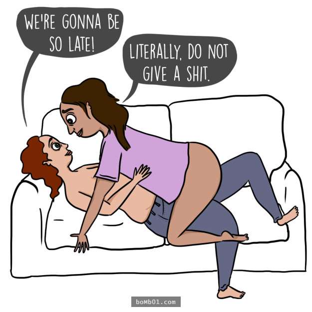 男:「我們就快要遲到了!」女:「確實如此,但別管它了。」(撲倒)